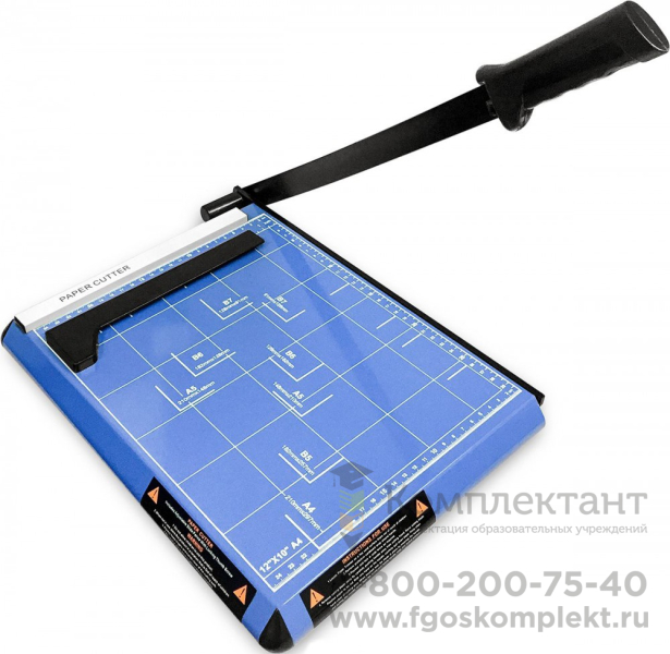 Сабельный резак с механическим прижимом для фиксации листов формата А4. Рабочая поверхность имеет удобную разметку для правильного позиционирования.