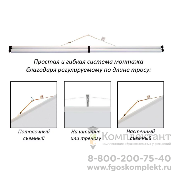 Благодаря гибкой системе размещения вы можете легко повесить экран не только на штатив, который идет в комплекте, но и на стену, потолок и любую другую точку опоры за регулируемый по длине трос.