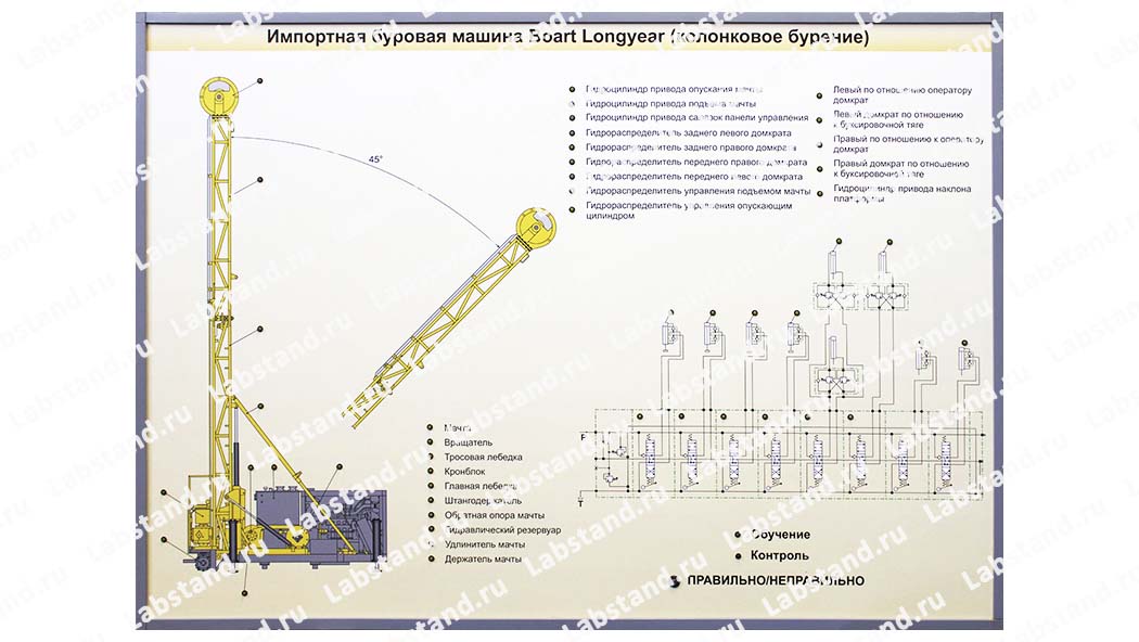 Назначение: Светодинамический стенд-планшет «Импортная буровая машина (колонковое бурение)» предназначен для освоения алгоритмов и принципов работы импортных буровых машин в профильных учебных заведениях.