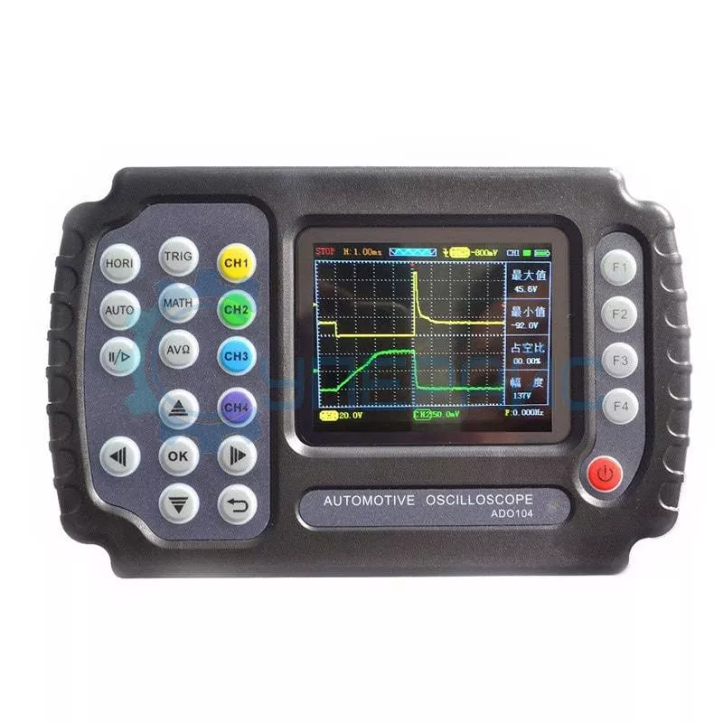 Скопметр имеет 4 канала, частоту дискретизации 100 Выб/с, полосу пропускания 10 МГц и объем памяти 4000 точек. Благодаря наличию функций мультиметра, он способен проводить измерения постоянного и переменного напряжения, сопротивления, емкости и обладает возможностью проверки диодов и прозвонки цепи. Прибор имеет возможность выбора черно-белого или цветного изображения, 5 режимов регулировки яркости экрана и может сохранять данные на USB-носитель, что облегчит последующую обработку сохранённых результатов. Осциллограф - мультиметр JINHAN ADO104, благодаря литиевым аккумуляторным батареям, работает с продолжительностью непрерывной работы до 5 часов, что обеспечит возможность применение осциллографа без привязки к сети, а также позволит эксплуатировать в «полевых» условиях, что очень актуально для автомобилей.