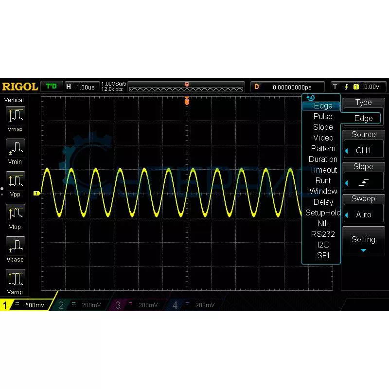 Режимы триггера | фронт, импульс, видео (NTSC,PAL,SECAM), Slope, рант, окно, шаблон, N фронт, истечение времени, длительность события, установка/удержание, RS232/UART, I2C, SPI |