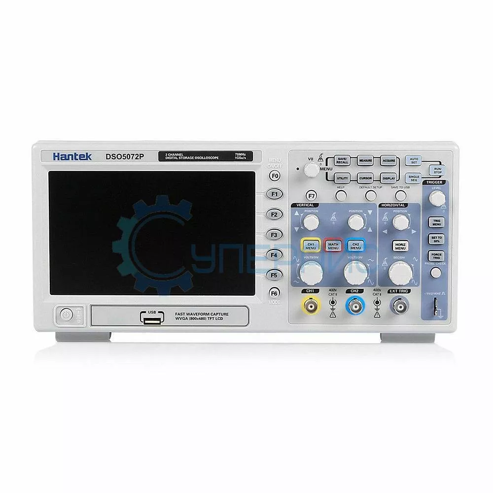 Осциллограф Hantek DSO5072P имеет частоту в 70 МГц, глубину памяти 40 кБ, тем самым сохраняя большой объем данных. ЖК-экран с разрешением 800 x 480 пикселей, отображает сигналы ярко и четко.