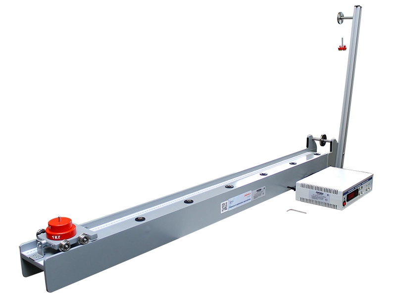 Оборудование конструктивно представляет собой установленную горизонтально дорожку качения, по направляющим которой под действием силы, обусловленной весом прикрепленного на конце перекинутой через шкив бечевки наборного груза, перемещается тележка с грузом. Время, пройденное тележкой с грузом, измеряется с помощью цифрового секундомера в момент пересечения меткой груза луча датчика.