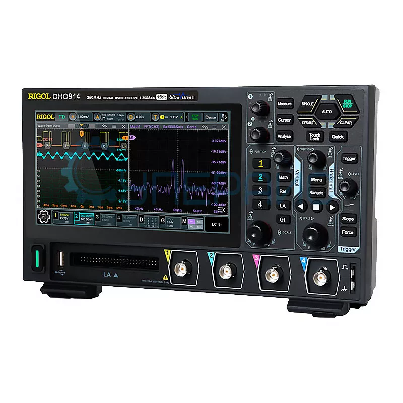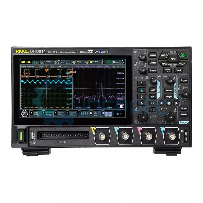 RIGOL DHO914 представляет собой стационарный осциллограф, главной чертой которого выступает высокая скорость захвата при исследовании электрических сигналов.