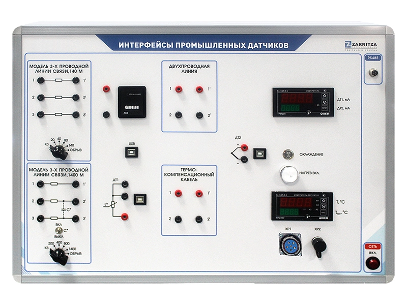 Стенд конструктивно выполнен в модульном настольном исполнении.Комплект учебно-лабораторного оборудования (далее  стенд) "Интерфейсы промышленных датчиков" предназначен для проведения лабораторных работ по ознакомлению студентов с конструкцией и принципом действия промышленных термометров сопротивления и термоэлектрических термометров, а также ознакомления со схемами их включения в аналоговых и цифровых каналах связи. Знакомство с понятиями "сопротивление линии связи" и "компенсация влияния изменения сопротивления линии связи". Знакомство с понятием "распределённые параметры линии связи", их влиянием на передачу цифровых сигналов и схемами подключения датчиков в цифровых каналах.