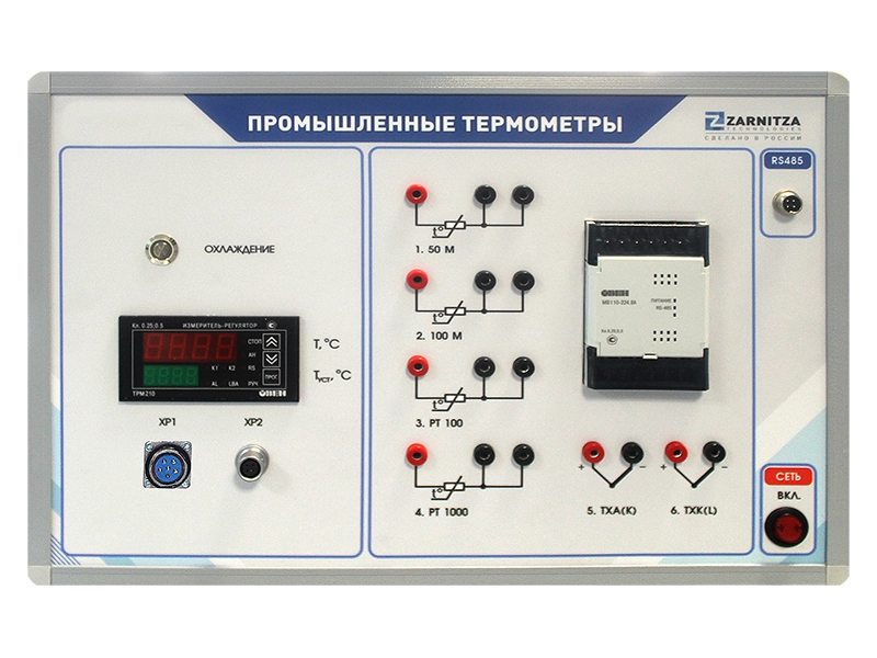 Комплект учебно-лабораторного оборудования (далее - стенд) "Промышленные термометры" предназначен для проведения лабораторных работ по ознакомлению студентов с конструкцией и принципом действия различных промышленных термометров, схем их включения, а также определению статических и динамических характеристик термометров, используемых в качестве датчиков температуры в системах автоматического регулирования.