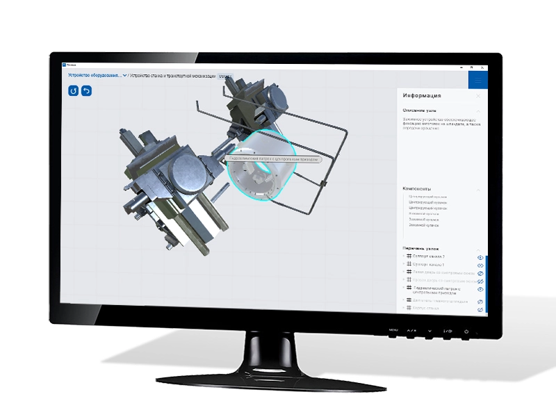 Имитируется работа пультов управления станками USC21/190, USC21/260, транспортной механизации станков в качестве трехмерной модели. Результат управления рабочими органами, функциональными узлами и механизмами с пультов управления отображается на экране в виде трехмерной модели.