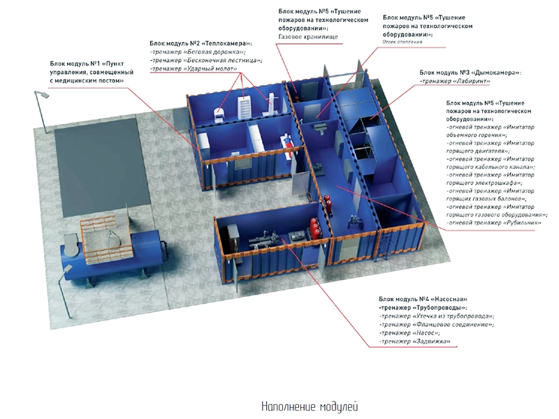 Модули имитируют сложную планировку помещений с многочисленными и сложными препятствиями, звуковыми и световыми эффектами, дымообразованием с регулируемой плотностью дыма, зонами локального и объемного нагрева.