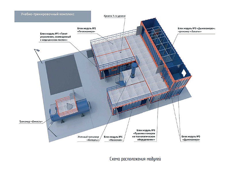 Для проведения тренировочных занятий, связанных с разведкой, поиском пострадавших, оказанию им первой помощи и эвакуации различными способами, включая тренировки по тушению пожаров техногенного характера, на кровлях первого и второго уровней.