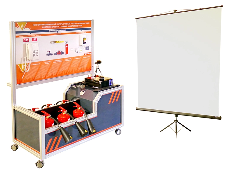 Универсальный интерактивный учебно-тренировочный комплекс средств тушения пожара МКУ-03 включает в себя Интерактивный тренажер огнетушителей и Интерактивный тренажер пожарного насоса.