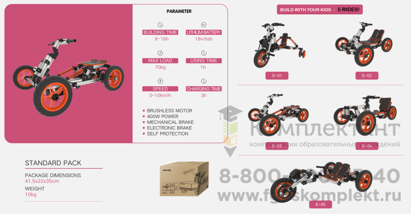 Получите увлекательный опыт вместе со своими детьми, строя разные средства передвижения. Все комплекты DOCYKE полностью совместимы между собой. А детали конструктора выполнены из материалов с повышенной устойчивостью к нагрузкам.Этот комплект является дополнением для DOCYKE L-KIT и позволяет создавать более 20 моделей с питанием от литиевой батареи. Трансформер DOCYKE E-KIT - это бесщеточный двигатель мощностью 400Вт, механический и электронный тормоз, влагозащита. Конструктор DOCYKE объеденит всю семью созданием необычного транспорта!