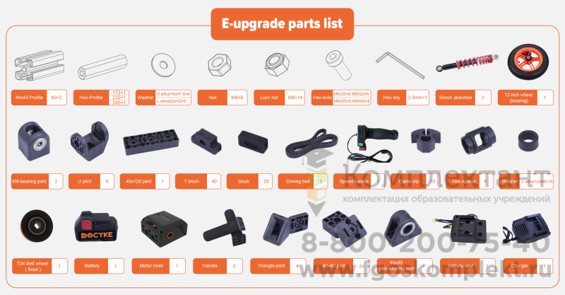 Вам не нужно иметь специальные инструменты, или собственную мастерскую, чтобы собирать Docyke. В комплекте Вы получаете все необходимое для создания крутых конструкций: алюминиевые профили, пластиковые соединительные элементы различных форм, болты, гайки, колёса, инструменты для сборки и многое другое.