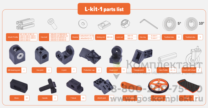 Все комплекты Docyke полностью совместимы между собой. Элементы наборов соединяются винтами М6 и М8, поэтому, если Вы хотите улучшить свой дизайн с помощью нестандартных элементов, вы можете легко сделать это с помощью универсальных элементов крепления.Прочность конструкции