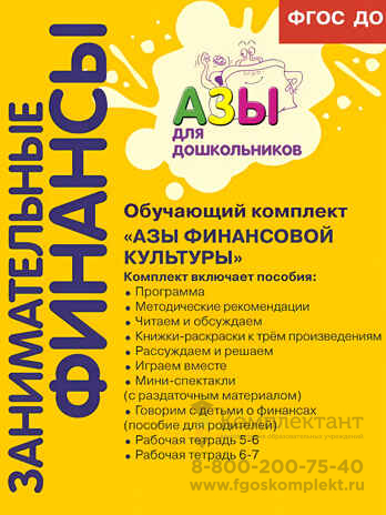 «Азы финансовой культуры». Обучающий комплект для старшей и подготовительной групп Обучающий комплект«Азы финансовой культуры» — это возможность: - Познакомить дошкольников с денежной сферой жизни. - Заложить правильное отношение к финансовым ресурсам. - Подготовить к принятию своих первых финансовых решений. - Мотивировать к бережливости. - Формировать систему ценностей. - Развивать интеллектуальную, нравственно-волевую и эмоциональную сферы личности дошкольника. Комплект включает пособия: - Программа. - Методические рекомендации. - Читаем и обсуждаем. - Книжки-раскраски к трём произведениям. - Рассуждаем и решаем. - Играем вместе. - Мини-спектакли (с раздаточным материалом). - Говорим с детьми о финансах (пособие для родителей). - Рабочая тетрадь: для 5-6 лет. - Рабочая тетрадь: для 6-7 лет.