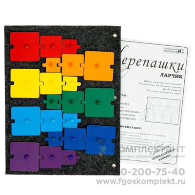 Черепашки Ларчик (дерево) Игра крепится к стене, что делает игру незаменимой как для индивидуального домашнего использования, так и для проведения групповых развивающих занятий в детских садах. Направлена на развитие сенсорных способностей (размер, цвет), творческое конструирование, развитие моторики руки, формирование пространственных представлений, математических понятий. Возраст: 1,5-4 Состав: 21 фигурка-черепашка семи цветов радуги; подложка (ковролин); инструкция.