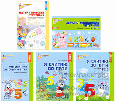 Комплект. Я считаю до 5. Математика для детей 4-5 лет. Колесникова Е.В. Комплект состоит из: 1. Математические ступеньки. Программа развития математических представлений у дошкольников. 2-е изд., 2. Математика для детей 4-5 лет. Метод. пособие к раб. тетради Я считаю до пяти. 2-е изд. ФГОС ДО 3. Я считаю до пяти. Рабочая тетрадь для детей 4-5 лет. ФГОС ДО 4. Я считаю до пяти. ЦВЕТНАЯ. Рабочая тетрадь для детей 4-5 лет. ФГОС ДО 5. Математика для детей 4-5 лет. Демонстрационный материал (40 цв.л. А4 + брошюра 28 с.) ФГОС ДО