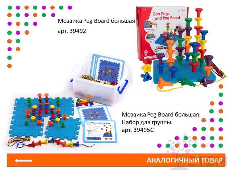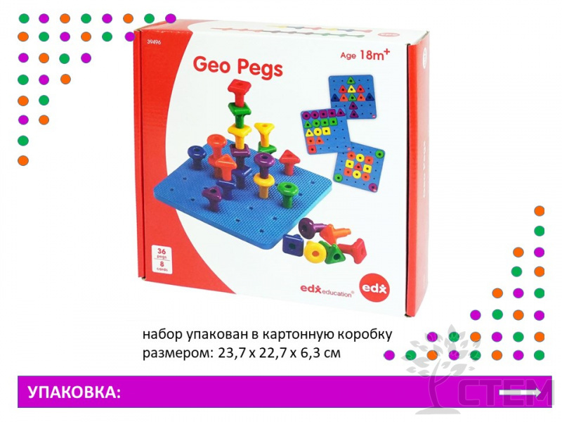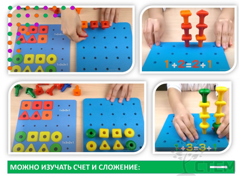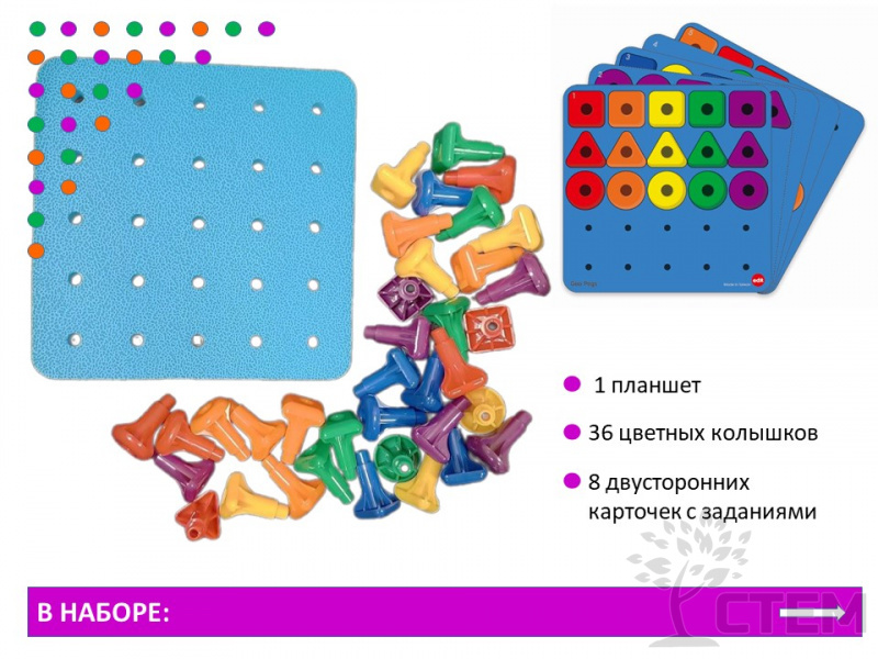 Набор представляет собой квадратное игровое поле с сеткой отверстий, в которые надо вставлять цветные колышки.