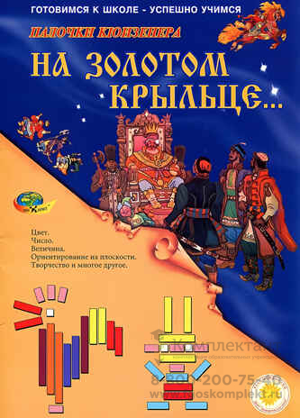 На золотом крыльце... Приложение к счетным палочкам Набор игр с цветными счетными палочками Кюизенера. В состав набора входят два блока иллюстративного материала к играм и упражнениям. 1 блок для детей 3-5 лет, 2 блок для детей 5-9 лет. В папке содержится 23 листа с заданиями (с 2-х сторон), методические советы по использованию комплекта. Советы по работе : Очень важно уточнить, знают ли дети цвет палочек (Задания детям: дай палочку такого же цвета, назови цвет палочек, возьми разные по цвету палочки, построй дом только из оранжевых палочек и т.д.). Умеют ли сравнить по длине (Задания: дай палочку такой же длины, найди палочку одинаковой длины с красной и т.д.). Помогите детям сделать открытие: все одинаковые по цвету палочки одинаковой длины, и наоборот. Также важно, чтобы дети усвоили взаимосвязь между цветом палочки и числом ей соответствующим. Белые — 1, розовые — 2, голубые — 3, красные — 4, желтые — 5, фиолетовые — 6, черные — 7, бордовые — 8, синие — 9, оранжевые — 10. Выбирайте игры из комплекта, ориентируясь на возможности ребенка, а не только на рекомендуемый возраст. Играйте вместе с детьми. Развитие интеллектуальных и творческих способностей не повредит ни Вам, ни вашему ребенку. Поощряйте самостоятельность ребенка. Понаблюдайте за игрой ребенка. Вы сделаете много открытий: умеет ли он ставить цель и добиваться результата, как относится к неудаче и т.д., все это поможет Вам увидеть, в чем именно ему необходима Ваша помощь. Радуйтесь успехам ребенка. Очень хорошо, если у Вас выйдет совместный семейный альбом с зарисовками придуманных из палочек изображений или сюжетов, а может быть, это будет коллективный сборник группы детского сада или класса, где будут представлены сочинения детей по мотивам сюжетов, выложенные из палочек. Выпускаемый нами комплект игр и упражнений «На золотом крыльце …» содержит: «Методические советы по использованию игр и упражнений с цветными счетными палочками Кюизенера» Приложение. Тексты дидактических сказок: «Улица разноцветных палочек», «Сказочный город». Два блока иллюстративного материала к играм и упражнениям: I блок «Играют малыши» (для детей 3-5 лет) II блок «Задания становятся сложнее» (для детей 5-9 лет)
