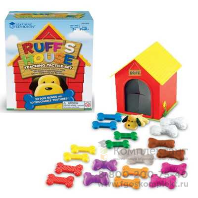 Развивающая тактильная игра \"Домик Руфа\" (тактильный), арт. LER9079 Помоги пушистому непоседе Руфу рассортировать сахарные косточки: гладкие и ребристые, скользящие и шероховатые, твердые и мягкие… Каких фактур здесь только нет! Занятия можно превратить в веселую игру, спрятав косточки в щенячью будку, а затем наощупь отгадывая, какая именно косточка спрятана. В наборе: - 20 косточек из разных материалов; - пластиковая будка. Длина косточки- 5 см.