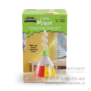 Когда дети выливают содержимое колбы в одну емкость, смешиваются два цвета.