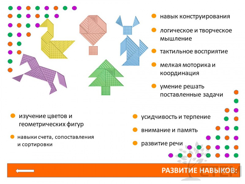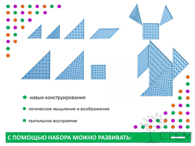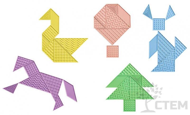 Предназначен для развития тактильного восприятия, воображения, логического мышления, усидчивости и внимания, помогает создавать целое из частей и предвидеть при этом результат своей деятельности, знакомит с основами геометрии (понятие площадь, фигура, угол, сторона и т.д.).