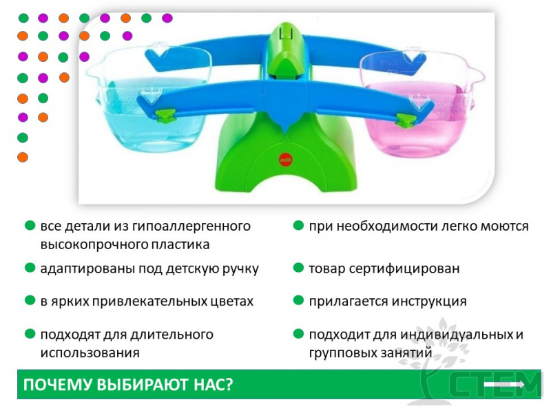 Учебно-игровое пособие «Весы детские с ковшами» предназначено для наглядного изучения понятия веса, объёма и получения практических навыков взвешивания.