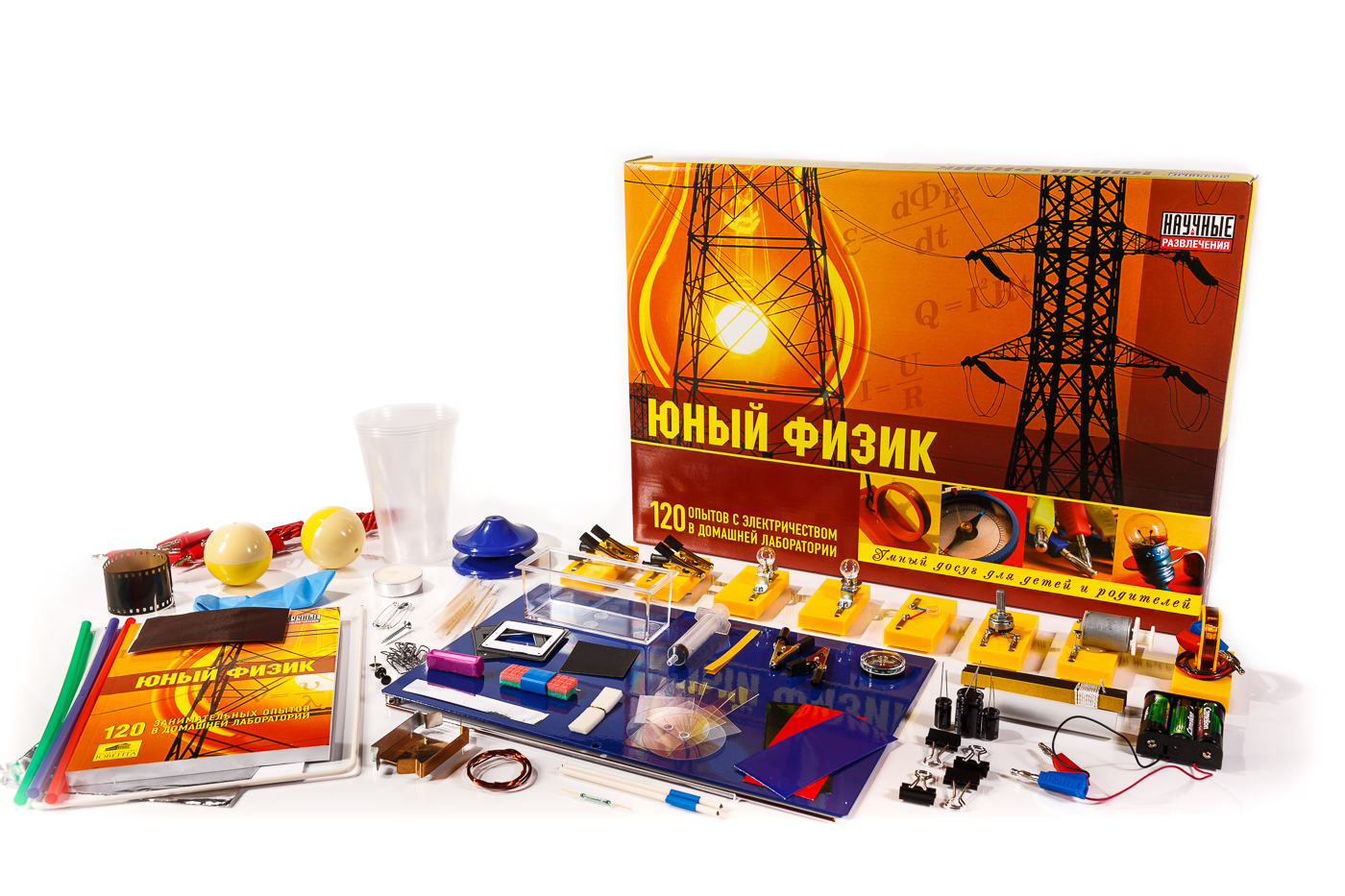 Научный набор «Юный физик» откроет для детей удивительный мир физики и позволит провести 120 экспериментов и опытов. Основы электричества, электростатики, магнетизма, электромагнетизма, электрохимии, оптики и техники доступно и доходчиво объясняются в подробной книге-руководстве, которая поможет разобраться в сути физических экспериментов.
