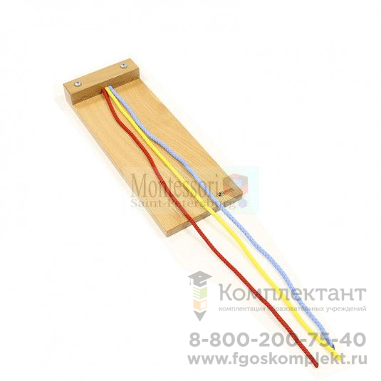 Деревянная доска (бук) с тремя закрепленными на ней разноцветными шнурами для плетения косички.
