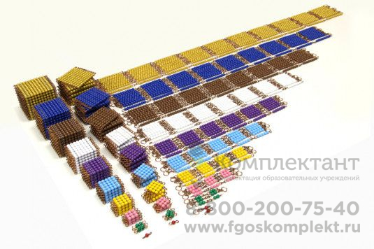 В комплект входят: кубы из бусин, пластины, длинные и короткие цепочки, являющиеся конкретным представлением «кубических» и «квадратных» чисел в линейном, плоскостном и пространственном изображении. В данный комплект деревянный стенд не входит.