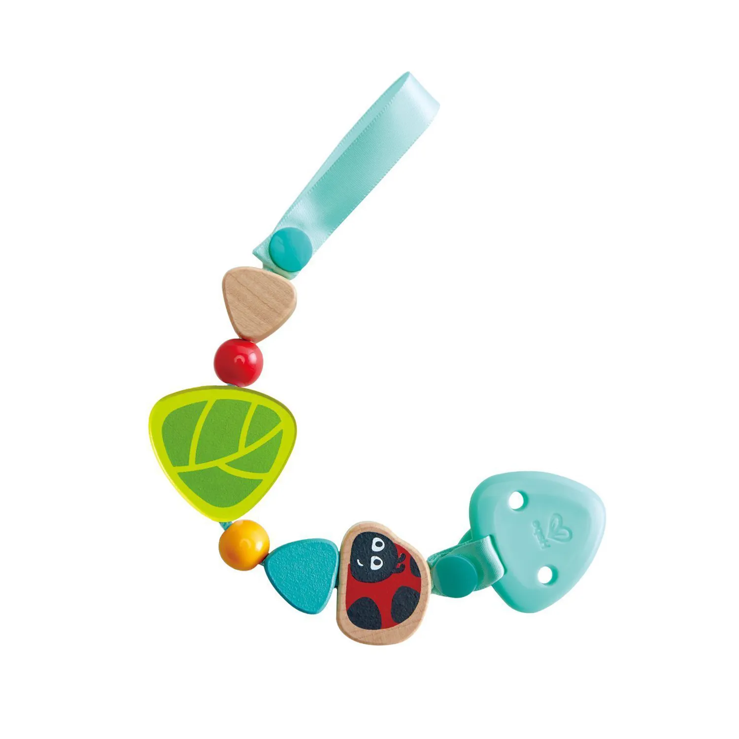 Благодаря удобной клипсе держатель легко прикрепить к нагруднику, одежде и одеялу малыша. Яркий дизайн и рисунком божья коровка привлекает внимание ребенка. Держатель выполнен в виде ярких нанизанных элементов. Все детали можно трогать, крутить.