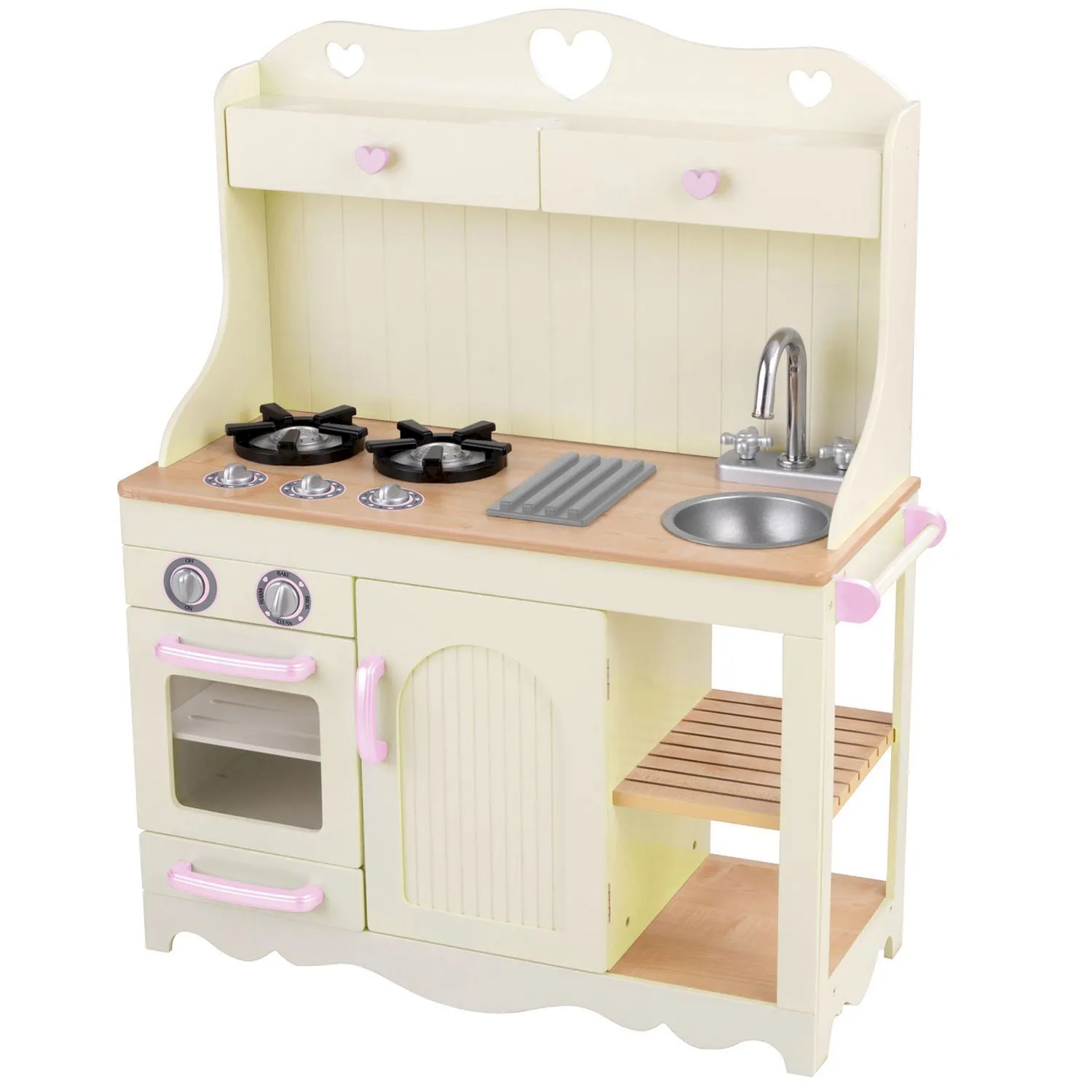 - Игрушечная кухня для девочки «Прерия" неслучайно получила свое название: в ее дизайне отчетливо видны элементы стиля кантри, характерного для классических американских ферм. Во-первых, это оформление стенки и дверцы шкафчика в виде деревянных панелей. Во-вторых, милые отверстия в форме сердечек. В форме сердечек также выполнены ручки верхних шкафчиков. Но умиления и очарования дизайну игрушки добавляют не только сердечки, но и розовые ручки, и резной край в основании кухни. Цветовая гамма в теплых оттенках дерева усиливает сходство с кухнями первых американских поселенцев.