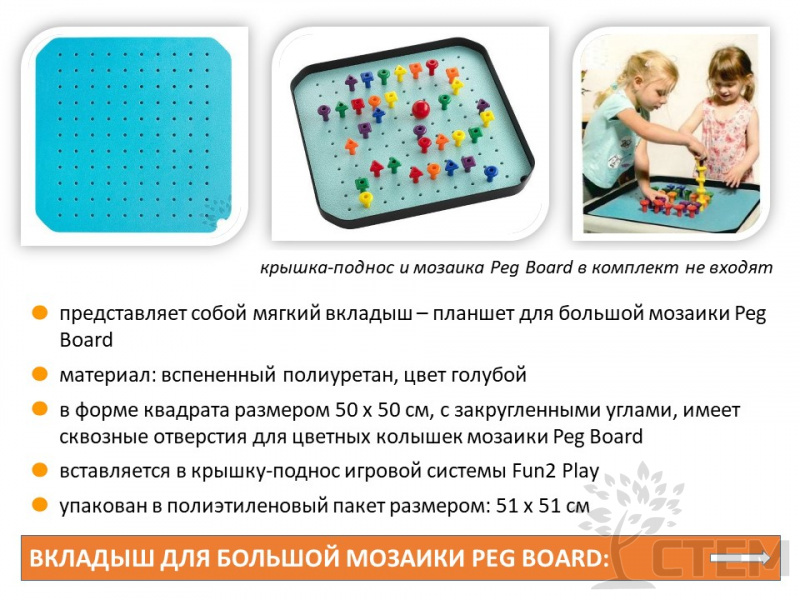 «Fun2 Play Дополнение: вкладыш для Большой мозаики Peg Board» представляет собой планшет для большой мозаики Peg Board, вставляется в крышку-поднос игровой системы Fun2 Play, предназначен для организации игровой деятельности детей, развития воображения и создания разнообразных творческих композиций.
