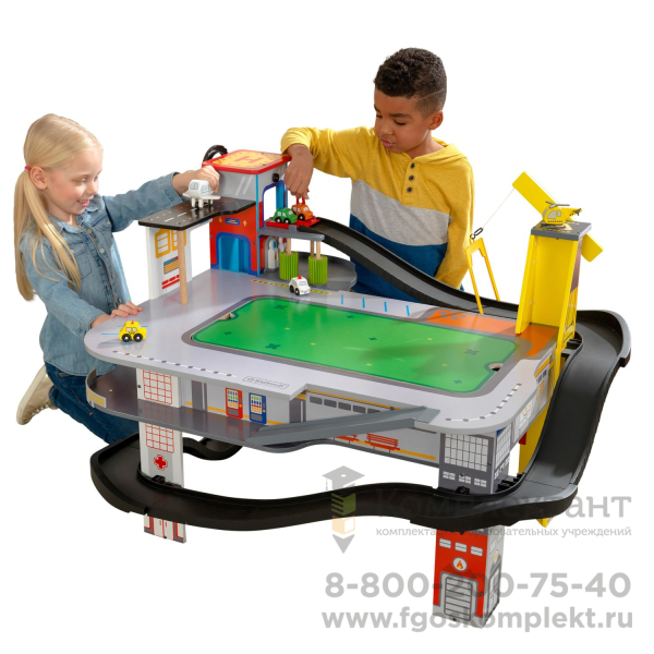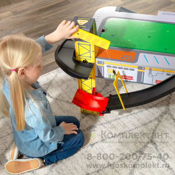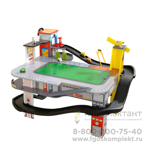 • В набор входят: самолет, вертолет и 4 машины, АЗС с автомойкой и насосами, вертолетная площадка и аэропорт, поезд и грузовой вагон со съемным грузом, подземное метро, нижняя колея с краном для вывоза машин на супер рампу.