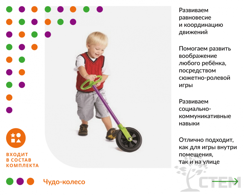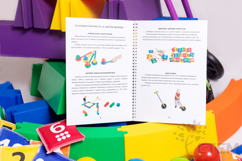 С его помощью вы сможете реализовать широкий спектр задач по физическому развитию детей. Уникальность пособий, в его составе, позволяет интегрировать в активность познавательное, социально – коммуникативное и математическое развитие.