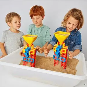 В каком направлении вращаются колеса?Почему они идут быстро или медленно?Как течет песок?Что происходит, когда поток регулируется на воронке?Или что происходит, когда колесо находится в другом положении?Дети могут самостоятельно следовать понятному руководству по визуальному конструированию, чтобы построить мобильную мельницу.