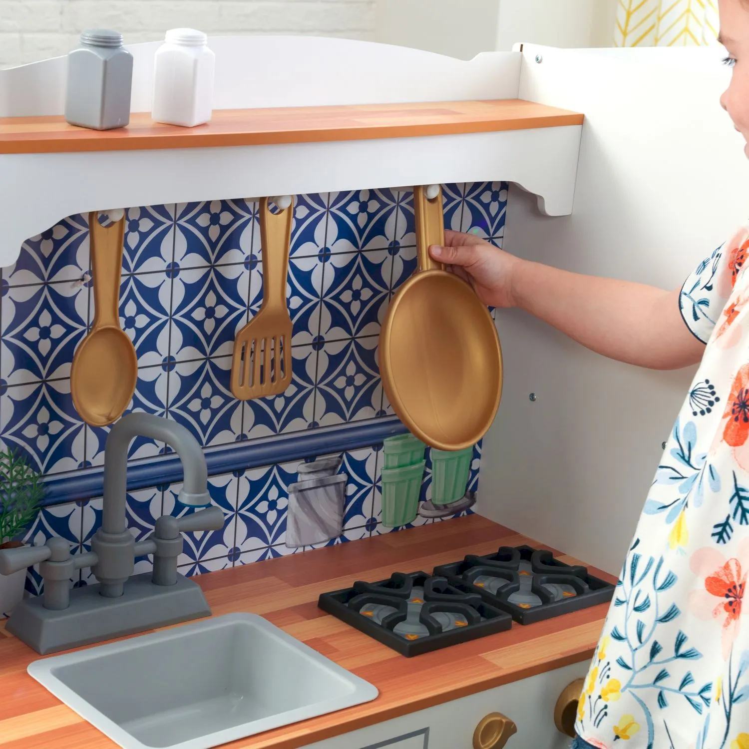 Игра на кухне стала намного вкуснее и захватывающей. Игровая кухня наполнена исключительными деталями и восхитительными функциями, включая магнитный холодильник с верхней морозильной камерой, чтобы дети могли украшать ее магнитами или составлять списки покупок. Нет ничего круче, чем работающий льдогенератор, выдающий пластиковые кубики льда. Когда дети будут готовы разжечь газовую плиту или духовку, они будут рады обнаружить, что при повороте ручки издают забавный щелкающий звук. Когда кулинарные творения находятся в духовке или микроволновой печи, дети могут с гордостью показать маме и папе, что они делают, через дверцы витрины.