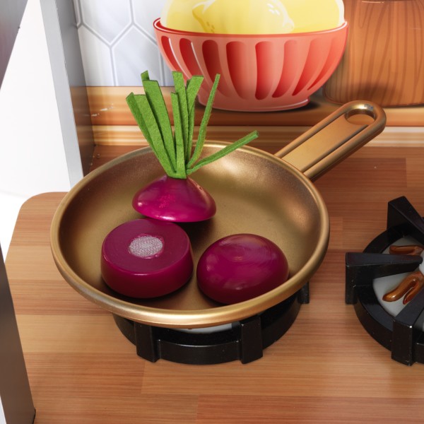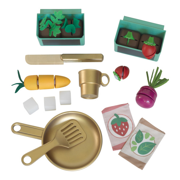 Развивайте свое воображение, собирая урожай на игровой кухне. В удобной кухня все продумано до мелочей. Рядом висят кашпо для выращивания овощей и боковой ящиком для хранения и переработки. Дети могут пройти весь процесс посадки полностью с кубикам из искусственной грязи, пакетикам с семенами и стеблями. Есть много нарезанных фруктов и овощей, чтобы создавать удивительные рецепты. Световые и звуковые горелки плиты, работающий льдогенератор добавляют больше реализма и азарта. Свежие оттенки и тканевые шторы делают творчество еще более ярким каждый.