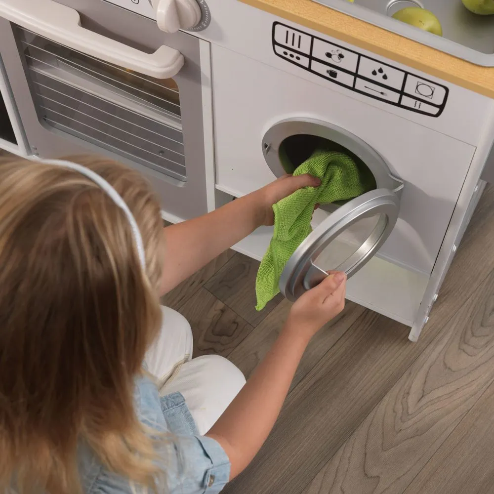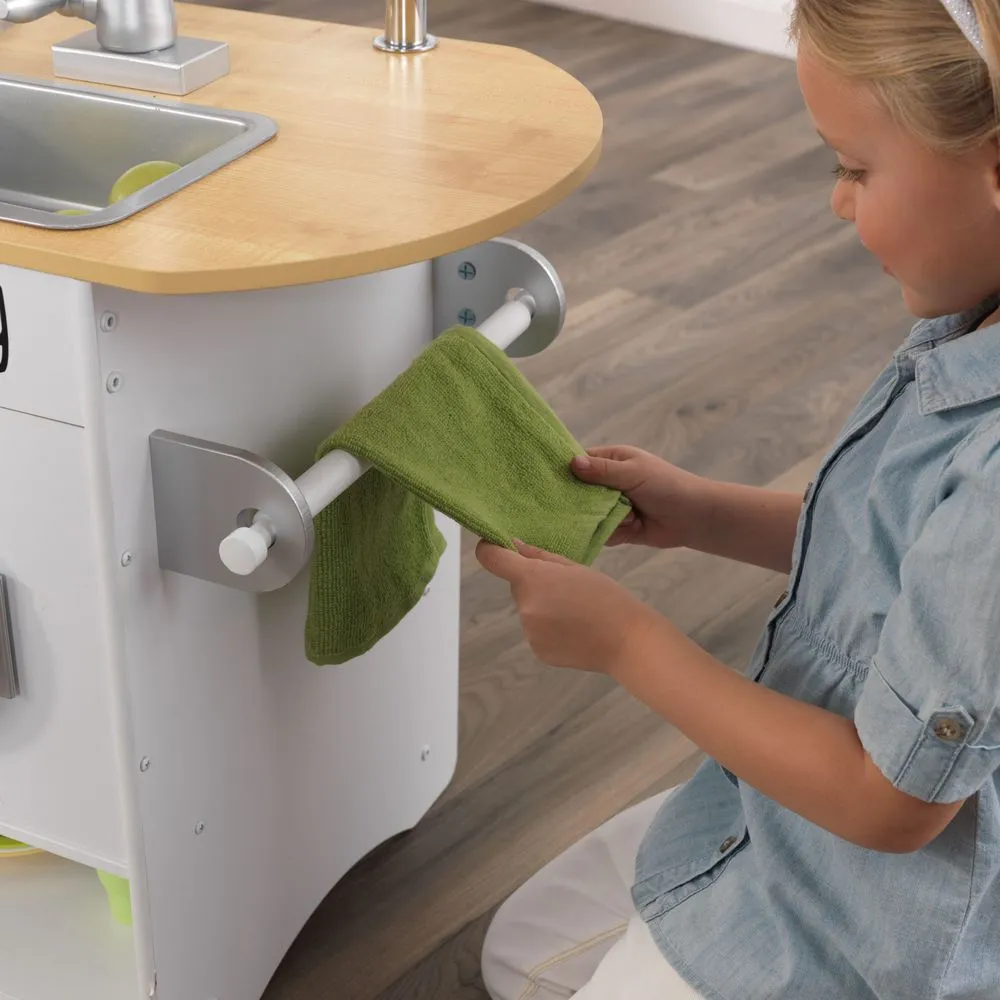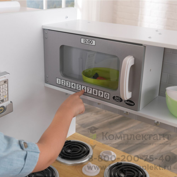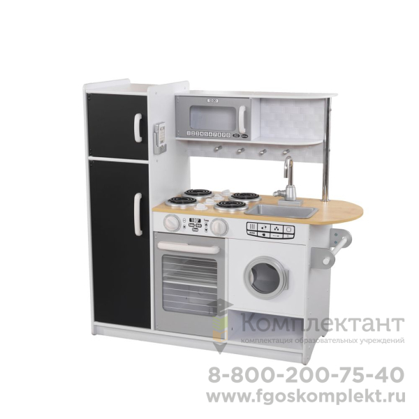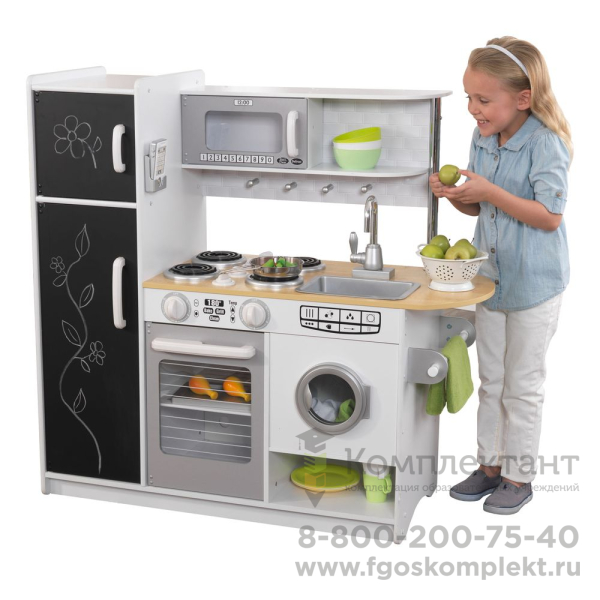 Описание отсутствуетОсобенности: - Данная кухня подходит для девочек старше 3 лет. - Она представляет собой кухонный гарнитур с техникой, а также дополнительными аксессуарами. - Кухня состоит из нескольких элементов: 1. Рабочая поверхность вмещает в себе съемную раковину с краном и варочную панель с 4 конфорками. 2. Под рабочей поверхностью находится духовой шкаф и стиральная машина. 3. С левой стороны располагается двухкамерный холодильник, дверцы которого представляют собой доски для рисования мелом. На одной из стенок холодильника установлен телефон. 4. С правой стороны находится держатель для полотенца или прихватки. 5. Над рабочей поверхностью располагается полочка с установленной на ней микроволновой печью. - Все дверцы элементов набора сделаны открывающимися, что придает игре особенного интереса. Кухня изготовлена из натурального и экологически чистого материала, который абсолютно безопасен для здоровья ребенка и не вызывает аллергических реакций. - В процессе игры ребенок сможет пофантазировать, развить мелкую моторику рук и весело провести свое свободное время.