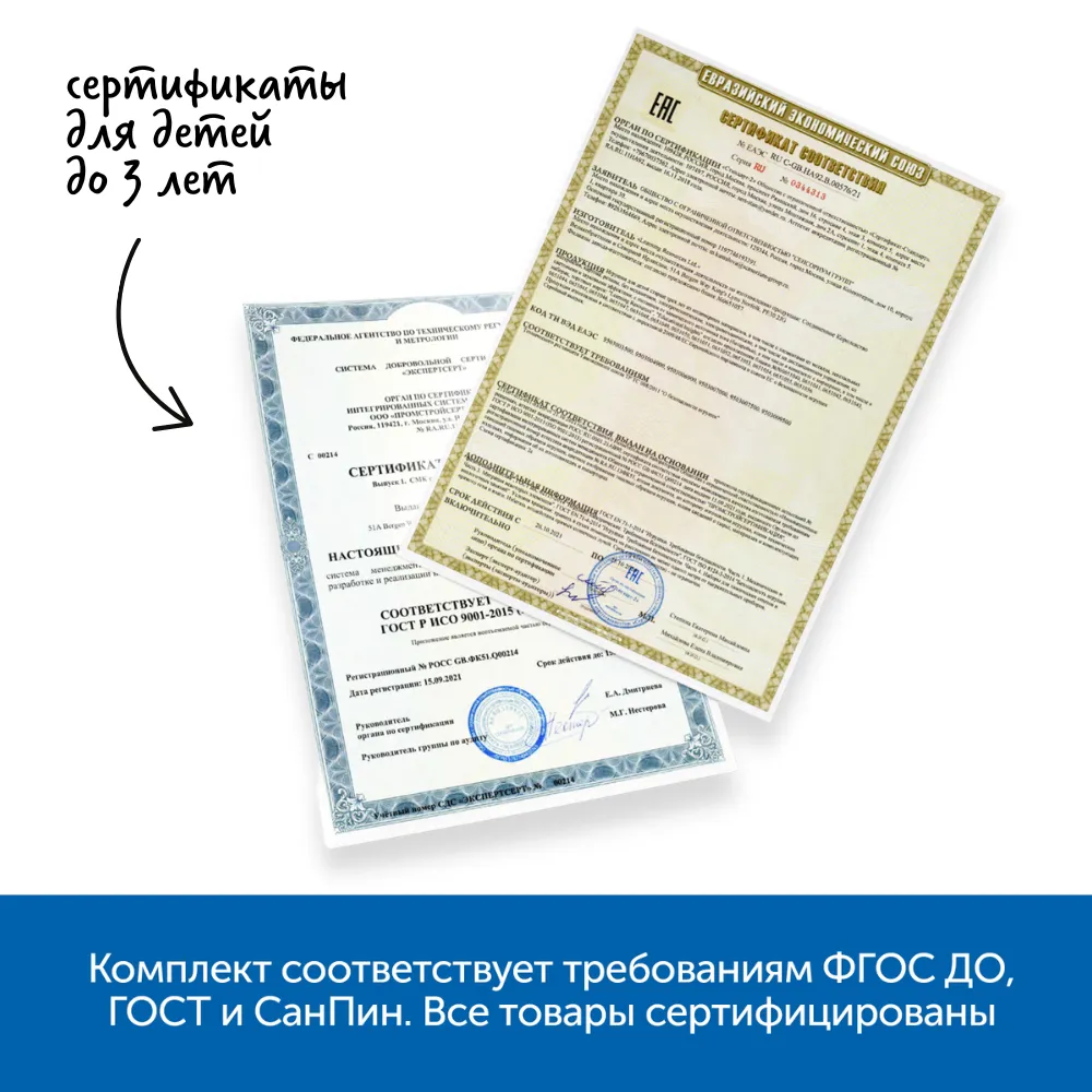 Комплект создан с целью реализации требований ФГОС в рамках комплексного использования предметно-развивающей среды, соблюдения принципов вариативности, полифункциональности, педагогической целесообразности и трансформируемости. Игрушки, входящие в комплект, обеспечивают высокий уровень воспитательно-образовательного процесса по освоению Основной общеобразовательной программы дошкольного образования. Каждый набор комплекта гарантирует эффективную организацию совместной деятельности педагогов и детей, а также дает возможность самостоятельной безопасной деятельности детей.