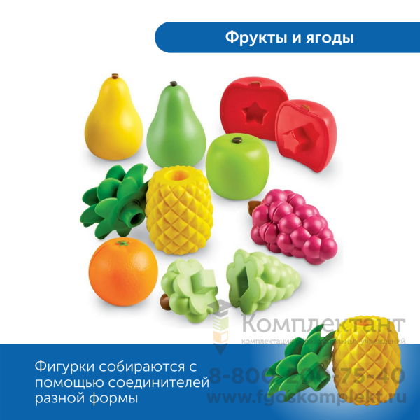 В состав комплекта входит 7 наборов фигурок. Фигурки состоят из половинок, которые необходимо правильно соединить. Фигурки представлены в виде животных, птиц, фруктов, ягод. Соединяя элементы между собой, малыши тренируют ловкость пальчиков и мелкую моторику рук, узнают цвета и простейшие геометрические фигуры, учатся считать, соотносить цифру с количеством в пределах десятки. Регулярное взаимодействие с комплектом способствует развитию речи: звукоподражание, увеличение словарного запаса.