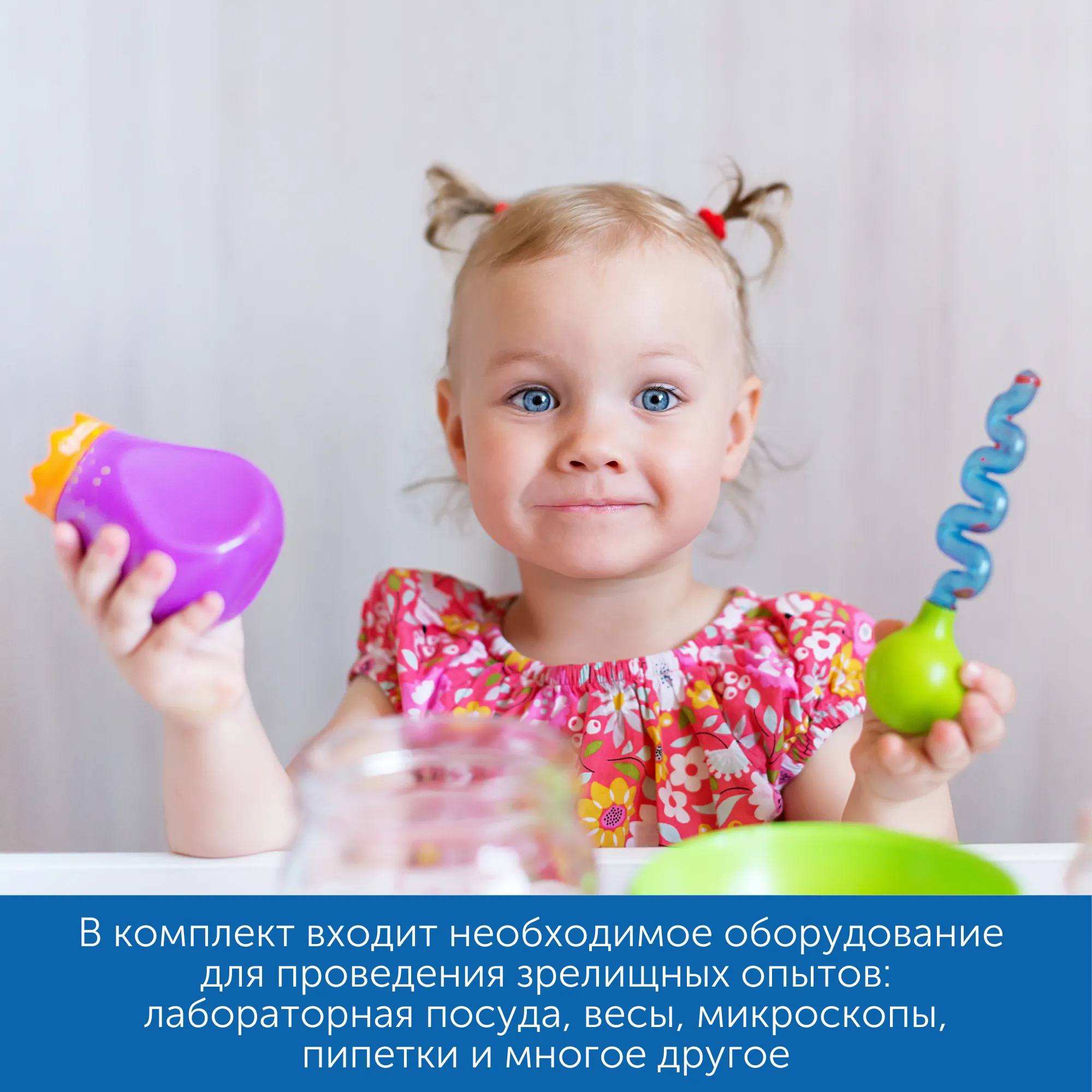 В данный набор для наблюдений и экспериментирования включена вся необходимая лабораторная посуда и инструменты для проведения измерений и экспериментов (микроскопы, пробирки разных размеров, лабораторные колбы, весы с объемными чашами, пипетки, воронки и проч.).