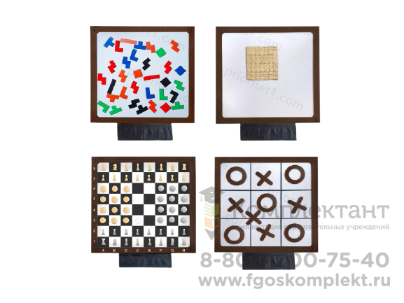 Состав набора: 4 панели с магнитным виниловым покрытием; Магнитные разноцветные элементы тетриса; Кости домино на магнитах; Плоские шашки и шахматы, крепящиеся магнитами; Магнитные однотонные крестики и нолики.