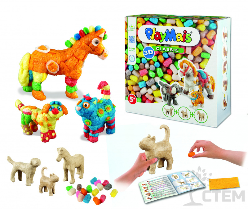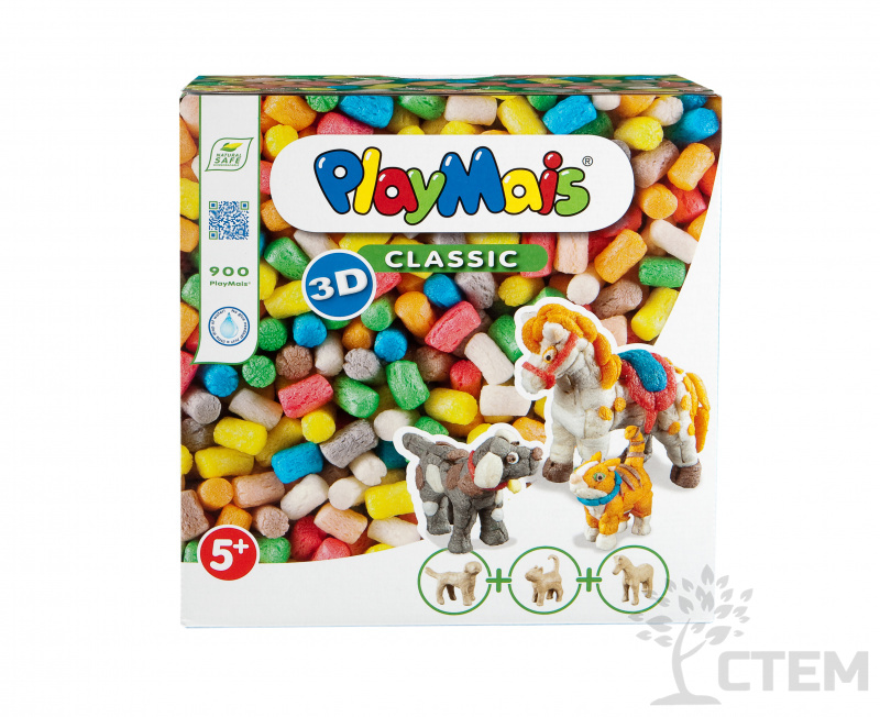 Серия мозаики CLASSIC 3D расширяет поле для творчества детей от 5 лет. Идеально подходит для игрового обучения. Дети знакомятся с различными темами в игровой и творческой форме. Каждая коробка содержит 900 PlayMais ® с различными заданиями, инструкциями и аксессуарами.