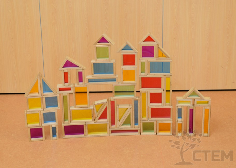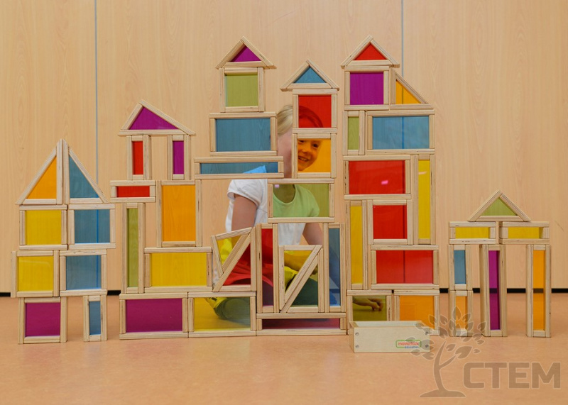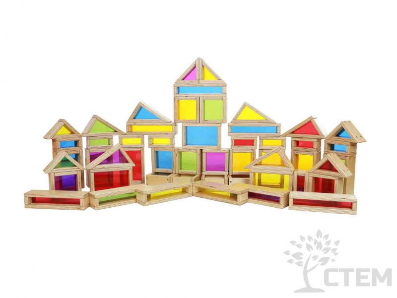 Набор из 51 деревянного блока разной формы и размеров с красочными акриловыми вставками.С его помощью ребенок знакомится с разными фигурами и цветами, учится считать, сортировать, сравнивать, используя воображение, строить различные конструкции.