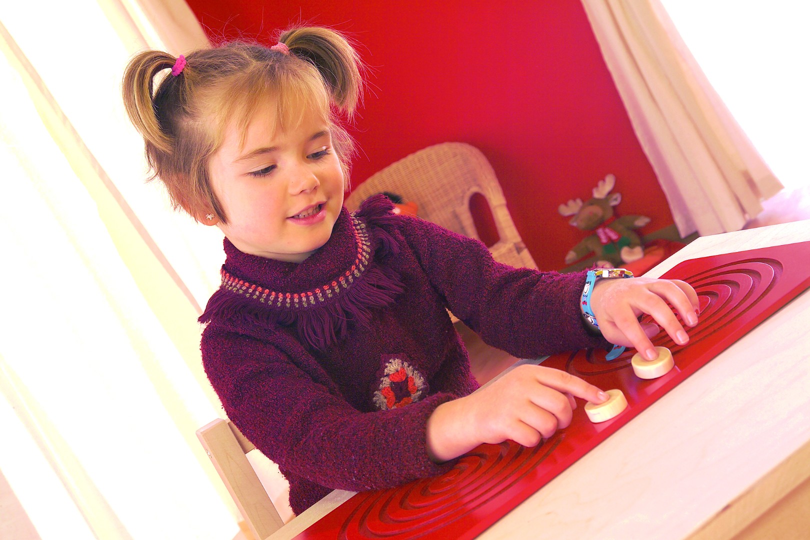 Игра развивает зрительно-тактильную координацию и мелкую моторику ребенка, благодаря чему он научится читать и писать, а также сосредоточиваться. С помощью специальных штифтов ребенок производит различные движения руками по шаблонам. Подходит для людей с ограниченными возможностями.