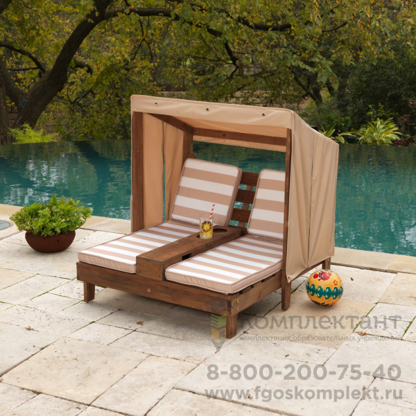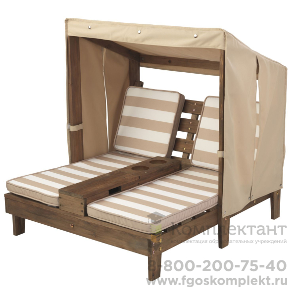 Новинка! Как приятно скрыться от жаркого солнышка в уютном шезлонге под навесом можно весело провести время как одному, так и с другом. В удобном подлокотнике легко разместить 2 бутылочки или 2 стакана с водой. Шезлонг расчитан на 2-х детей от 3 до 6 лет.• Данный предмет детской мебели представляет собой шезлонг, рассчитанный на двух человек. • Он изготовлен из натурального и экологически чистого материала – дерева. • У шезлонга специальная прочная и устойчивая конструкция, а также натуральный древесный оттенок. • Шезлонг позволяет расслабиться и отдохнуть сразу двум деткам, так как у него предусмотрено наличие двух комфортных лежаков с мягкими полосатыми матрасиками. • Благодаря навесу, располагающемуся сверху, дети не перегреются на солнце и смогут проводить длительное время на улице даже в жаркую погоду. А на боковых стойках шезлонга предусмотрено наличие шторок. • Между лежаками располагается удобный подлокотник с выемками для стаканчиков или бутылочек с прохладительными напитками. • Данный предмет мебели отлично подойдет для установки в саду, на детской площадке или на даче. • С такой мебелью ребенку будет приятно проводить время на улице как в теплую, так и в жаркую погоду, а также беседовать с лучшим другом за стаканом сока или газированной воды. • Максимальная нагрузка - 60 кг.