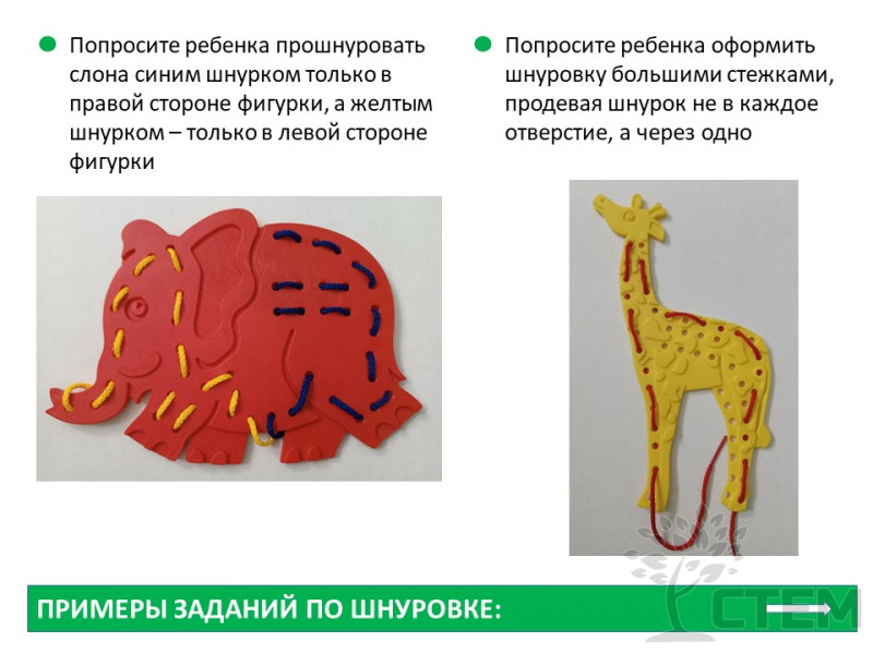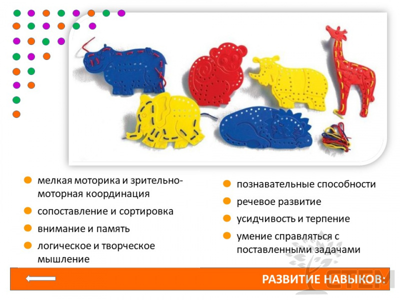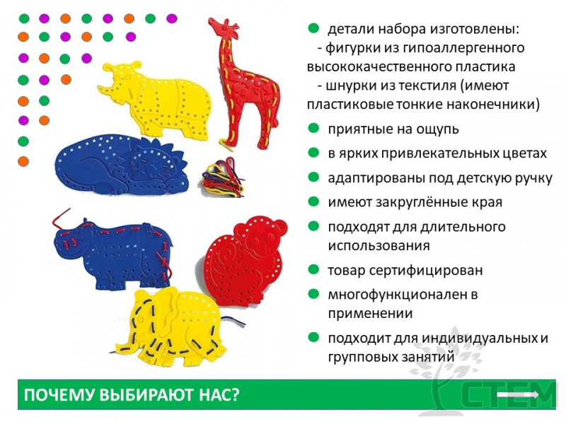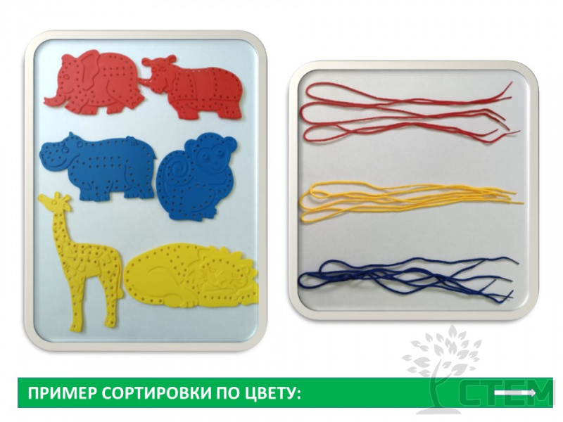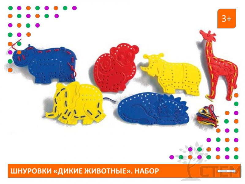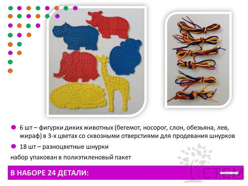 6 диких животных: бегемот, обезьяна, носорог, жираф, слон и лев, 3 цвета, 18 шнурков.