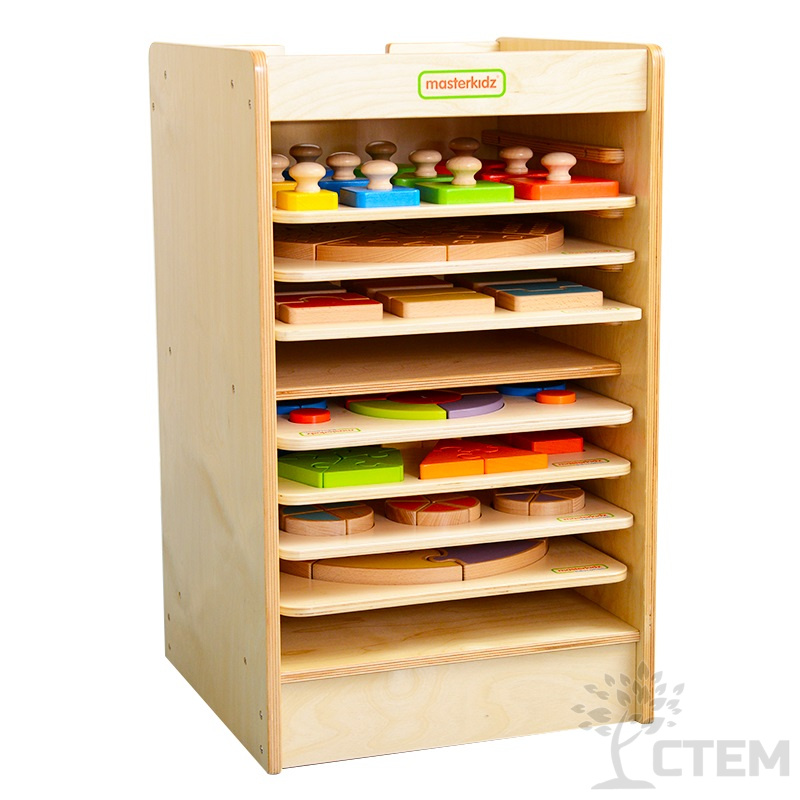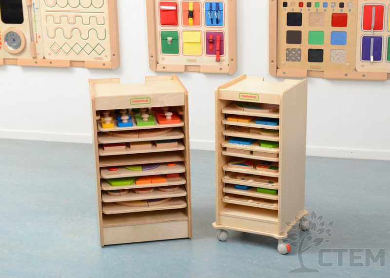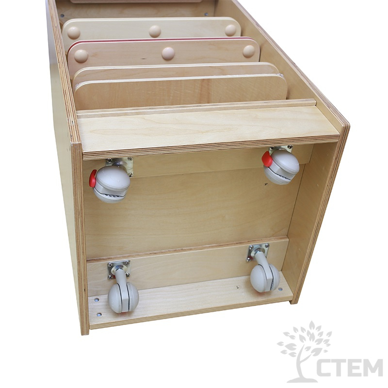 Стеллаж выполнен из березовой фанеры. Верхняя часть предназаначена для размещения панелей размером 38*28см. Внутри расположены 10 направляющих в виде полозьев для размещения игровых панелей. В комплекте идет дополнительная опорная панель с колесиками для удобного перемещения. Поставляется в разобранном виде с простой инструкцией по сборке. Размер в собранном виде: 41 х 41 х 69 см в высоту.