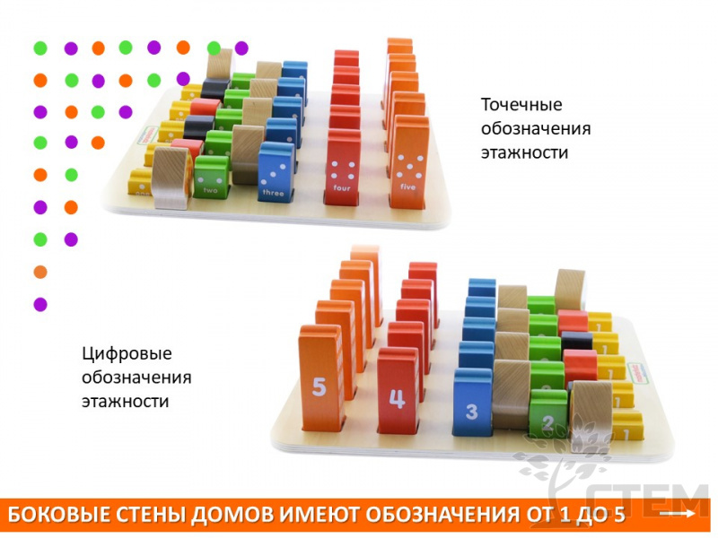 - 25 зданий пяти разных высот (каждое здание имеет количественную маркировку в виде точек от 1 до 5, соответствующую цифровую маркировку от 1 до 5 и обозначение цифры на английском языке),