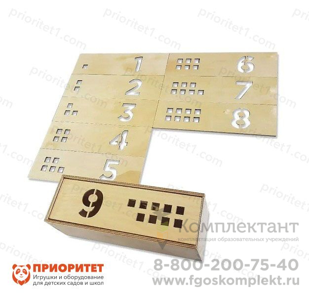 - Представляет собой набор панелей, на поверхности которых вырезаны цифры от 1 до 9 и соответствующее им количество точек. Цель ребенка – научиться считать и писать цифры, прикасаясь к вырезанным поверхностям.
